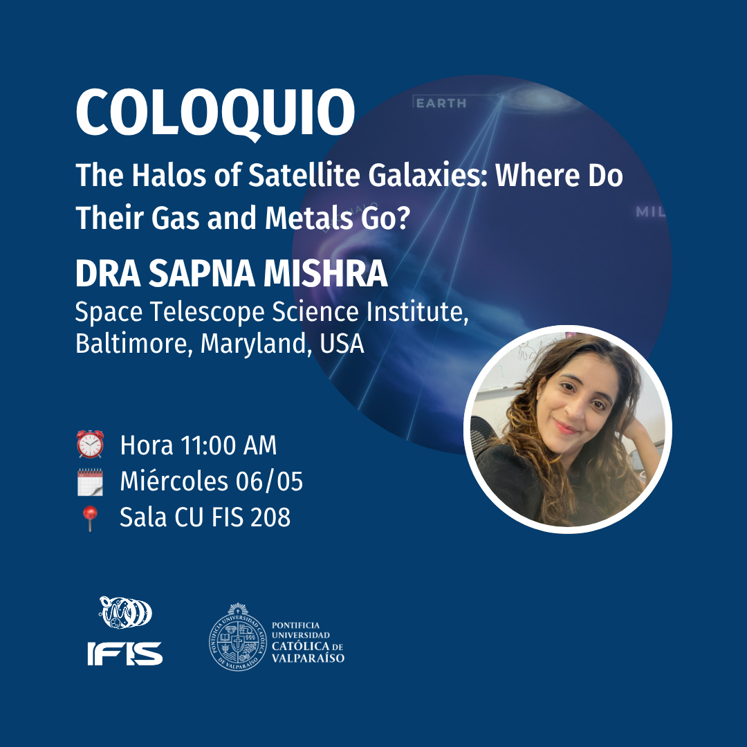 El próximo miércoles 06 de mayo, la Dra. Sapna Mishra, académica del Space Telescope Science Institute (Baltimore, Maryland, USA), dictará el coloquio “The Halos of Satellite Galaxies: Where Do Their Gas and Metals Go?” a las 11 horas en la Sala 208 del Instituto de Física, Edificio de Ciencias, Campus Curauma, PUCV.