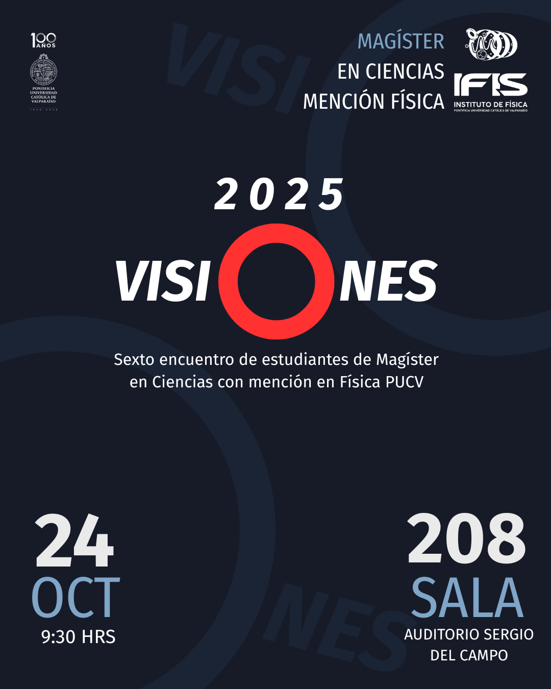 El evento “Visiones 2025” se realizará este viernes 24 de octubre desde las 09:30 hrs en la Sala 208 (Auditorio Sergio del Campo) del Instituto de Física PUCV. Esta actividad es una plataforma única para que las y los estudiantes del Programa de Magíster en Ciencias con mención en Física presenten sus avances y resultados de sus investigaciones.