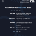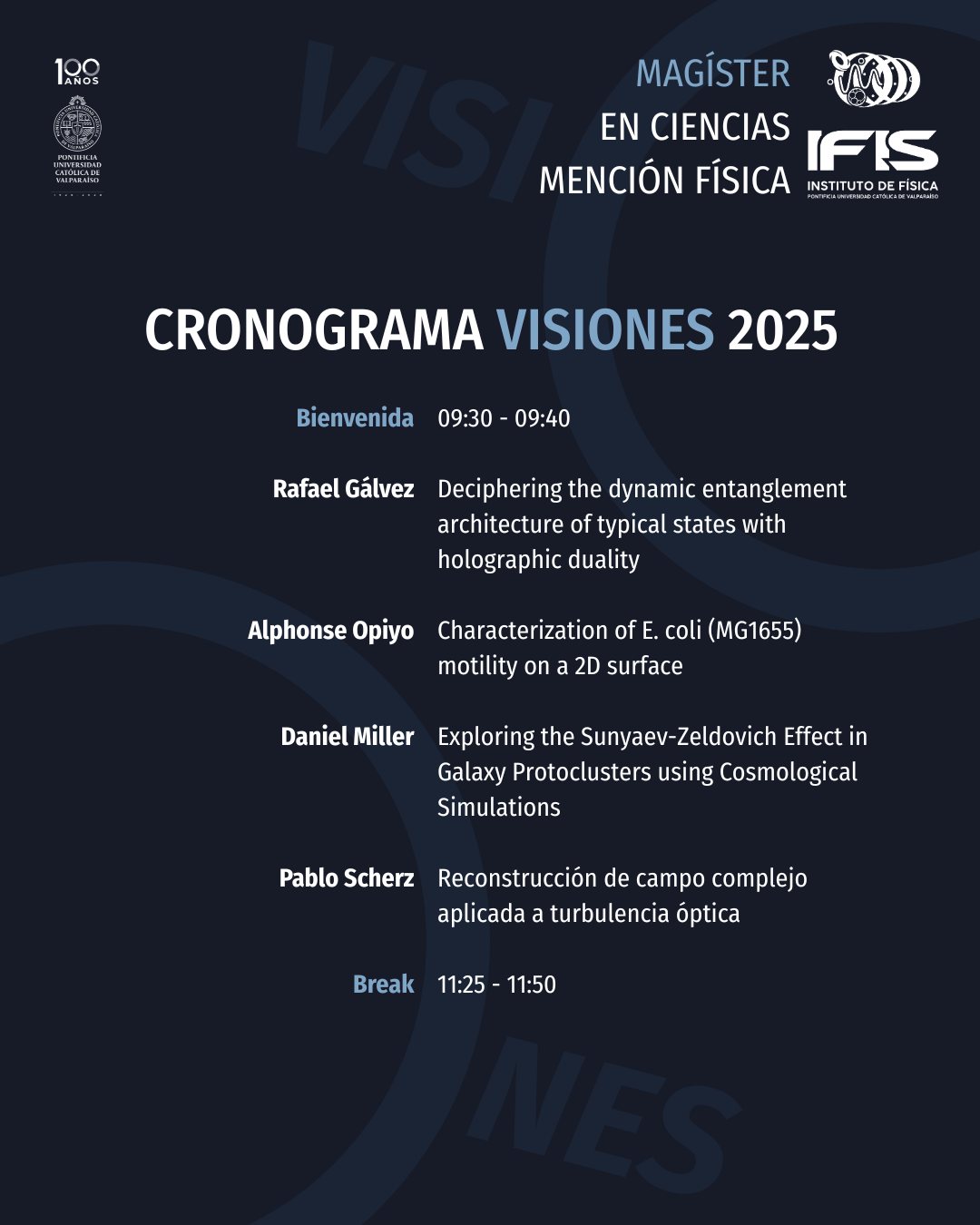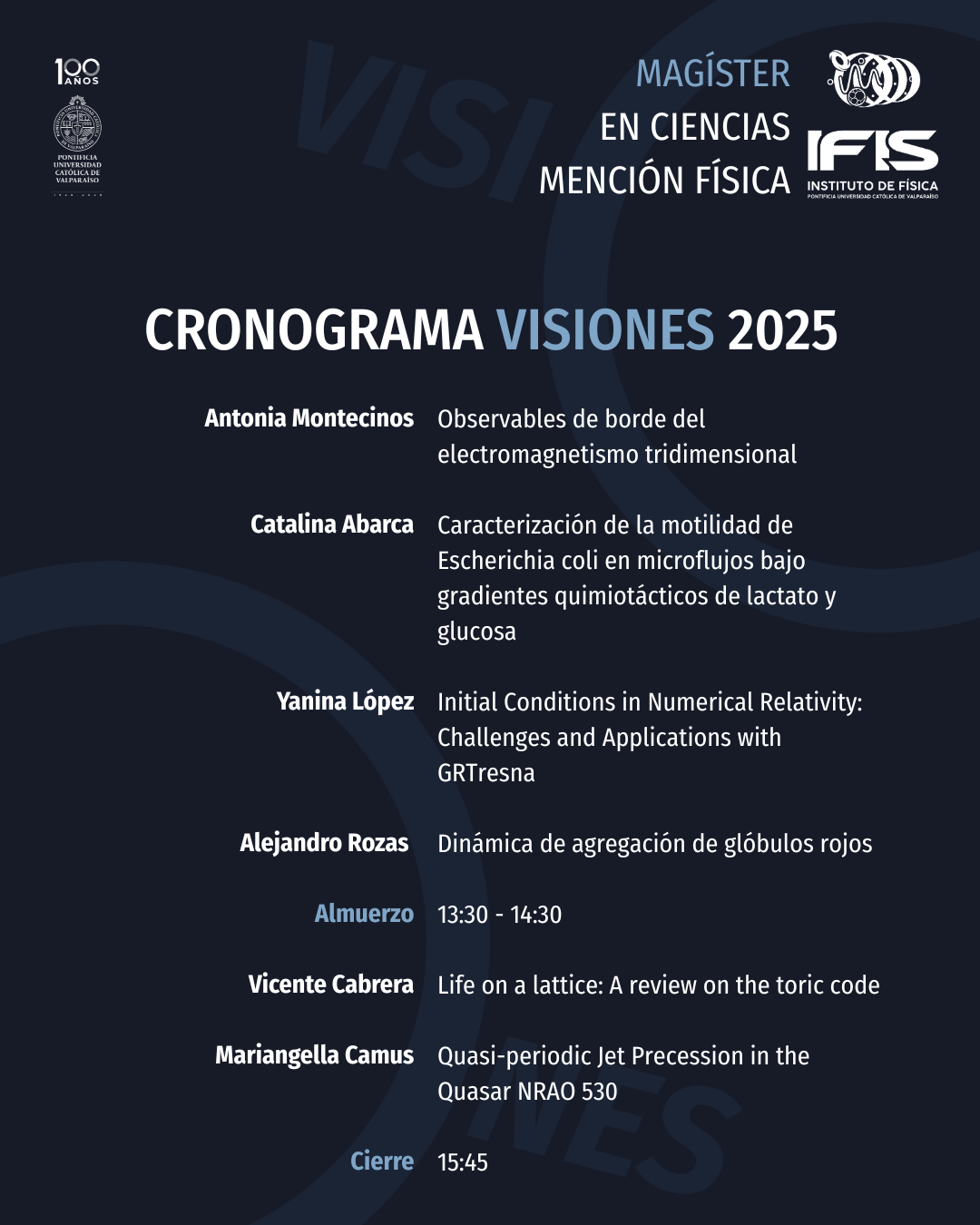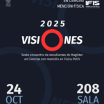 El evento “Visiones 2025” se realizará este viernes 24 de octubre desde las 09:30 hrs en la Sala 208 (Auditorio Sergio del Campo) del Instituto de Física PUCV. Esta actividad es una plataforma única para que las y los estudiantes del Programa de Magíster en Ciencias con mención en Física presenten sus avances y resultados de sus investigaciones.